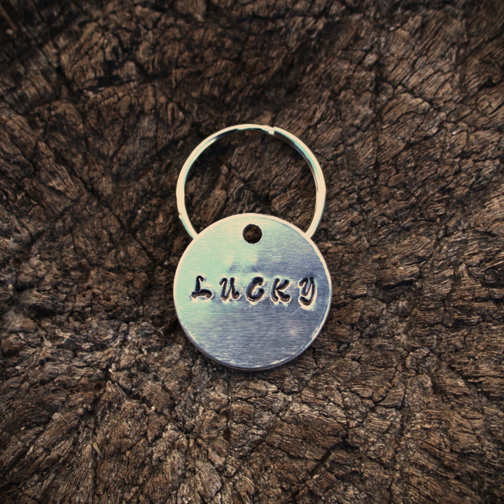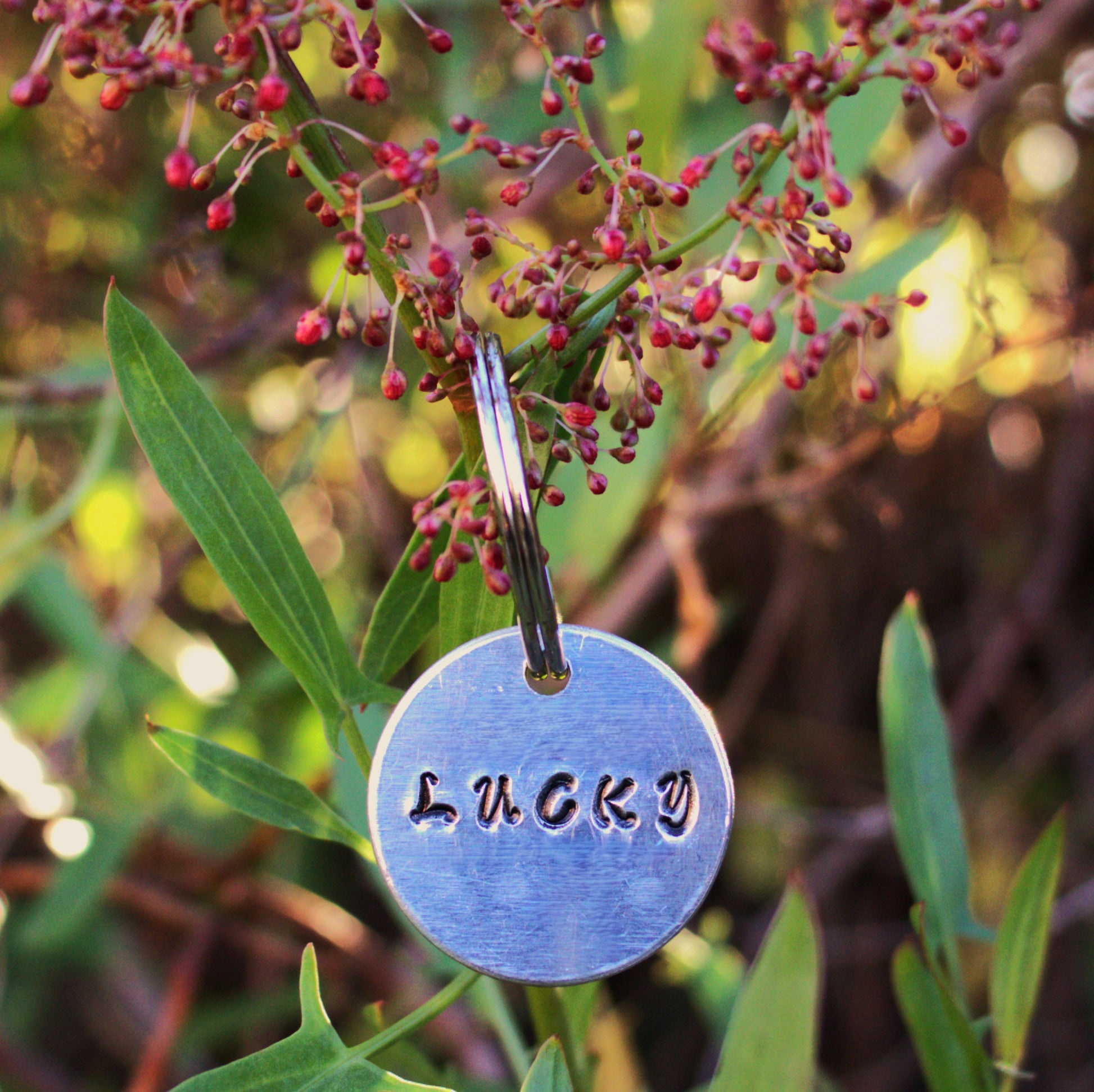 Personalised Pet ID Collar Tag – Uppercase Font Hand-Stamped Aluminum (2 size option)